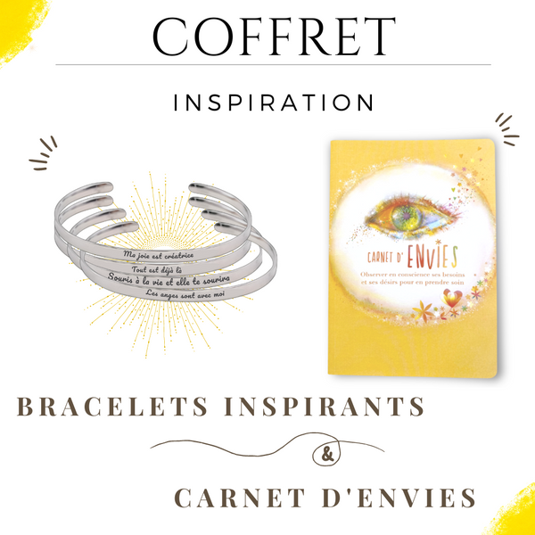 Nous avons réuni ensemble le carnet d'envies et le coffret de bracelets aux messages inspirants, pour vous soutenir dans vos réalisations personnelles et celles de vos objectifs.